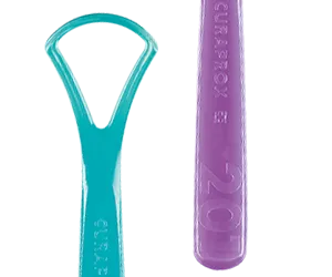 The CURAPROX CTC 202 double-bladed tongue scraper… features two blades – one smooth, one serrated – which work together to thoroughly remove the bacteria that build up on the tongue.