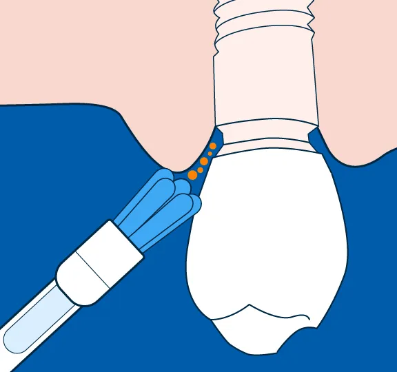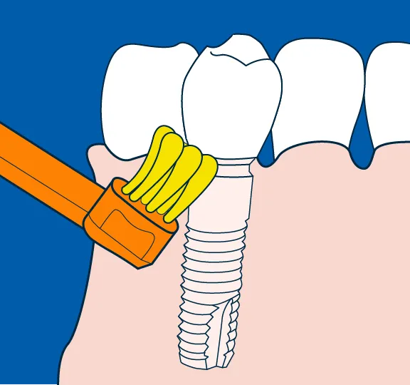 «Move the brush up and down – and forwards and backwards – using small, circular motions so the head moves and the filaments can reach underneath the implant.»